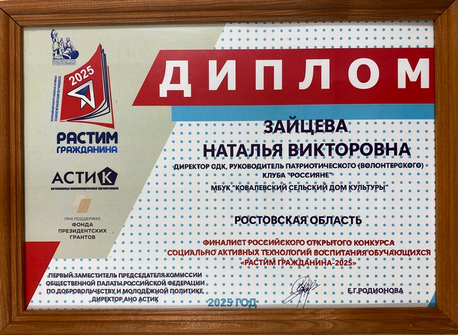 Лидер молодежного патриотического (волонтерского) клуба «Россияне», директор Ковалевского сельского Дома культуры х. Платово Наталья Викторовна Зайцева в числе лучших специалистов по гражданско-патриотическому воспитанию приняла участие в финале Всероссийского конкурса социально активных технологий «Растим гражданина».
