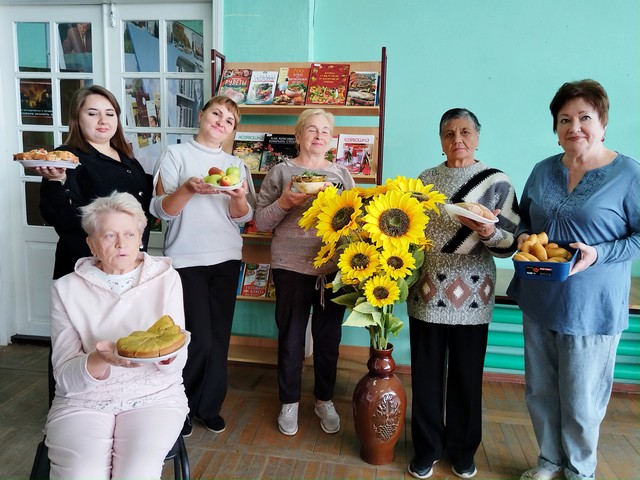 Читальный зал библиотеки украшен комнатными цветами, подсолнухами, здесь же в вазе стоит «Роза — испанская гостья». Постепенно подходят участники клуба. Татьяна Владимировна радушно встречает гостей: разговор о погоде, о яблоневых посадках, абрикосах, персиках и о главном, чего не отнять у наших женщин, — это о заготовках на зиму.
