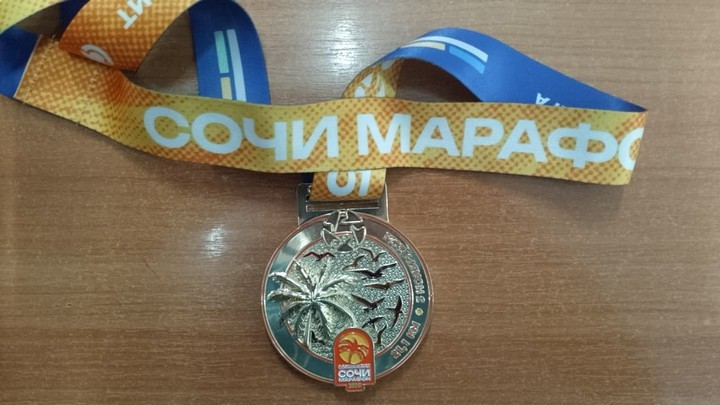 Виктор пробежал полумарафон за 2 часа и 8 минут. Привез в Красный Сулин медаль и сувениры от спонсоров Сочинского марафона.